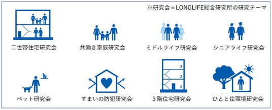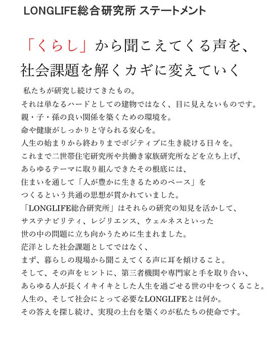LONGLIFE総合研究所 は、「LONGLIFE(いのち、くら し、人生)」に関わる社会課題解決のために、くらし方の研究と提案、ならびにその成果を活かした情報の発信や新規事業・サービスの開発を行う組織です。特徴として、自社だけに閉じるのではなく、自治体や他の民間企業、顧客の皆様と緊密に連携し、開かれた組織として研究成果を追求していきます。それと同時にサステナビリティ、ウェルネス、レジリエンスなど「LONGLIFE」にまつわる様々な観点からの研究で得た知見を積極的に発信し、あらゆる人が長く豊かな人生を送ることができる社会の実現に貢献していきます。なお、これまでの二世帯住宅研究所・共働き家族研究所・シニアライフ研究所は、組織としては各研究会へと形を変えて、それぞれの活動を継続してまいります。