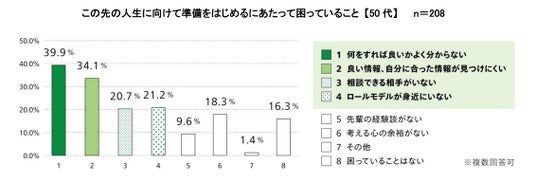先の人生をより幸せに過ごすための準備を始めるにあたって困っていることに関する質問では、「何をすれば良いかよく分からない」「良い情報、自分に合った情報が見つけにくい」といった項目は30%を超え、3人に1人以上が自分にとっての「情報整理」に手間取っていることがわかります。「相談できる相手がいない」が「ロールモデルが身近にいない」20%以上となることからも、情報整理に手間取りながらも、「頼りになる存在」がいないことも、悩みの種なのかもしれません。