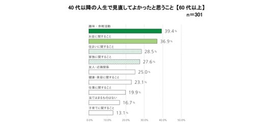 - 60代にとって40代以降で見直してよかったことは「お金」「趣味」に次いで「住まい」が約3割