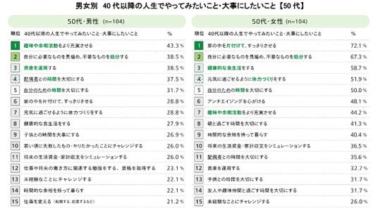 また、40代以降の人生でやってみたいこと・大事にしたいことについて、女性は片付け・処分、健康的な食生活・体力づくりが上位に。男性は、趣味・余暇活動の充実、処分、資産運用が上位に。50代で急激に物事の判断が他人基準から自分基準になり、自分のしたいことをするという「自分志向」が背景にあるのかもしれません。