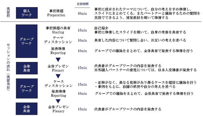 外国人パートナーの役割は“International delegates(異文化代表)”、すなわち異なる価値観・考え方をもった存在として議論の多様性を促進します。日本人受講者にとっては、自国文化やビジネス習慣を客観視する、また異なる文化に関心を高める機会となります。