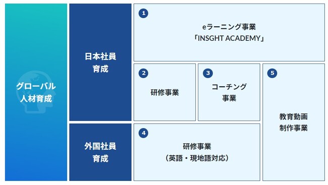 日本社員向けでメインとなるビジネスが1.eラーニング事業の「INSIGHT ACADEMY」です。「INSIGHT ACADEMY」は国内唯一のグローバル人材育成特化型eラーニングサービスとして国内有数のグローバルカンパニー各社様に評価され、各業界全般にわたって幅広くご利用いただいています。また、クライアントの固有の育成課題にも貢献するべく、海外事業に経験豊富な5000人の専門家集団の知見とノウハウを有効活用し、2.研修事業、3.コーチング事業も展開してます。