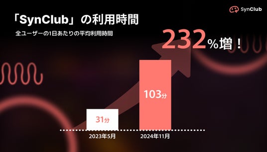 AIチャットアプリ「SynClub」は、1日あたりの平均利用時間が100分を超え、リリース当初(2023年5月)と比較して232%増加しました。増加の要因としては、「SynClub」のAIキャラの魅力や機能追加など、ユーザービリティの向上と共に、AIチャットへの関心が広まっていることと考えます。こういった利用時間増加の傾向があることから、日常生活のどのタイミングでも習慣的に「SynClub」を利用していただけるような機能改善を進めております。