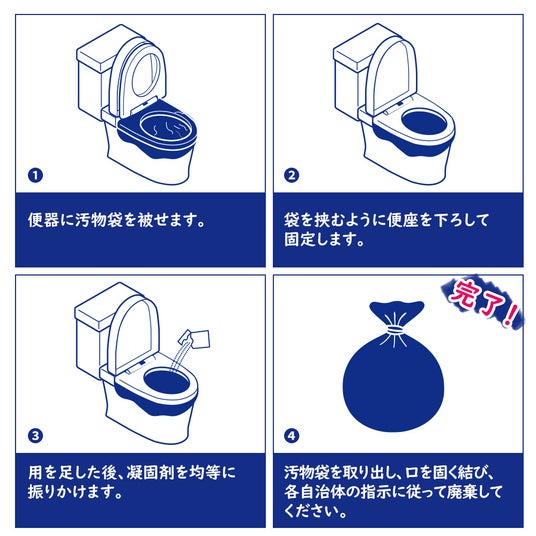 組み立ての必要がなく、すぐに使える簡易トイレです。15年の長期保管が可能!日本国内での消臭・抗菌試験にも合格した凝固剤を採用しているため、清潔にお使いいただけます。フック陳列にも対応したパッケージで店頭販売用としても活用できるタイプです。