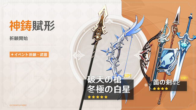 期間中、限定★5武器「長柄武器・破天の槍」、「弓・冬極の白星」などの出現率が大幅にUPします。
