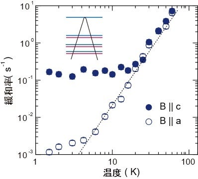 ディラック半金属の中でも重元素からなる物質では、強いスピン軌道相互作用から相対論的な効果が期待されます。そこで、安定な元素の中で最も重いビスマス化合物(BaMnBi2)が理想的なディラック半金属であることに着目し、その磁気励起をNMRで微視的に調べました。Mnイオンは磁気秩序し強い磁化を発生するため、バルクの磁化測定ではディラック電子を直接見れませんが、NMRを使うとディラック電子のいるBiサイトを選択的に検出することが可能となります。NMR緩和率の温度、磁場、方位依存性を詳細に調べた結果、動ける電子のエネルギーがディラック点近傍に位置することがわかりました。また、磁場下で軌道運動が量子化した状態の緩和率(B||c)が、磁場の影響のない状態(B||a)に比べて極低温で100倍以上にまで増大することを見出しました。これは二次元ディラック方程式に基づく理論計算から予想されたものよりはるかに大きく、スピン軌道相互作用によってスピン分極が増大した効果を考慮する必要があることを意味しています。