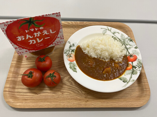 この取り組みは、響灘菜園で発生する出荷できない規格外トマトを利用したレトルトカレー「トマトのおんがえしカレー」を地域の子ども食堂に提供するとともに、本品の一般販売による収益の一部を子ども食堂に寄付するものです。
