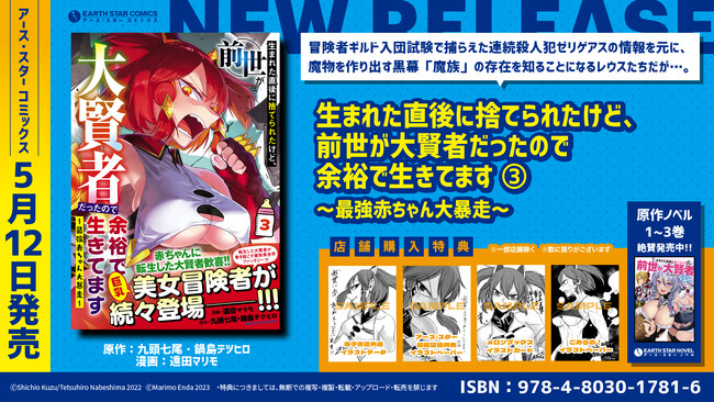 アース・スターノベルで刊行中のノベルが原作で、現在コミック アース・スターで掲載中の人気作品『生まれた直後に捨てられたけど、前世が大賢者だったので余裕で生きてます ~最強赤ちゃん大暴走~』(原作:九頭七尾・鍋島テツヒロ 漫画:遠田マリモ)第3巻を5月12日(金)に発売いたします。