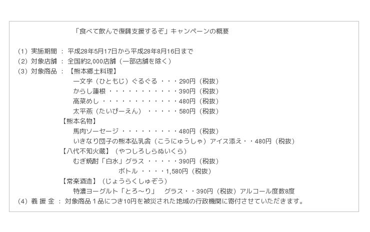 この度、株式会社モンテローザ(本社 東京都武蔵野市 代表取締役 大神輝博)は、被災地支援の一環として、「食べて飲んで復興支援するぞ」キャンペーンと題し、熊本県の郷土料理などを平成28年5月17日から平成28年8月16日まで、全国約2,000店舗(一部店舗を除く)で新たに販売し、対象商品1品につき10円を義援金として被災された地域の行政機関へ寄付する活動を実施させていただきます。