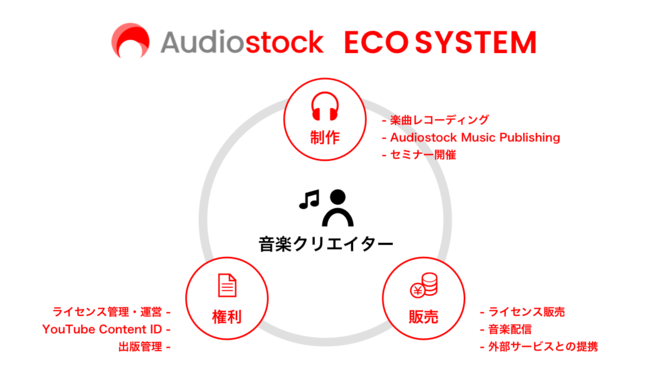 Audiostockは音楽の使用ライセンスを売買できるサービスです。音楽クリエイターは自身で制作した音楽を登録して使用権を販売することができ、売上に応じた印税を受け取ることができます。顧客は単品購入及びサブスクリプション方式で購入手続きを行うだけで音楽の利用許諾を得ることができ、映像・ゲーム・アプリ等の商用コンテンツに音楽を組み込むことができます。