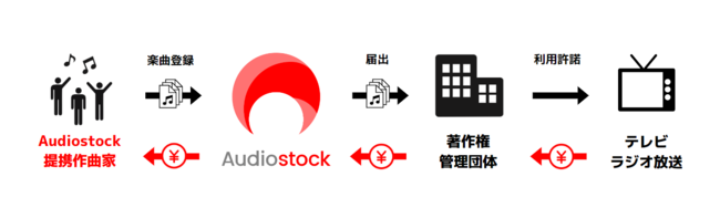 「Audiostock Music Publishing」では、Audiostockで活躍中の一部の音楽クリエイター「Audiostock提携作曲家」の作品を当社が預かり、著作権管理団体へ届出を行うことで、作品がテレビ・ラジオ放送で利用された際に印税分配を行います。(※1)