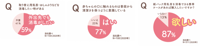 「チュチュ紙パック用乳首」を使用しているパパママにとったアンケートによると、“赤ちゃんの口に触れるものは普段から清潔さを保つように意識している”と答えた方が77%となり、“取り替え用乳首・おしゃぶりなどを消毒したい時があるか”という問いには、約6割にも及ぶ59%の方が“外出先でも消毒がしたい”と回答しました。