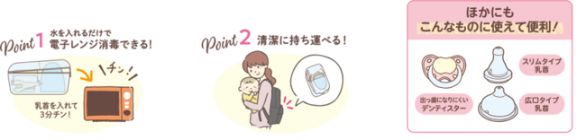 赤ちゃんの口に触れるおしゃぶりなど、清潔さが気になるものを衛生的に持ち運ぶことができ、外出先では、水を入れ電子レンジ500W~600Wで3分加熱することで簡単に消毒することができます。