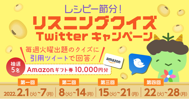 株式会社ポリグロッツ(本社:東京都新宿区、代表取締役:山口隼也)は、2月1日(火)~2月28日(月)まで英語リスニングクイズTwitterキャンペーンを開催いたします。クイズにご正解した方の中から抽選で、 Amazonギフト券1万円分を合計20名の方にプレゼントいたします。