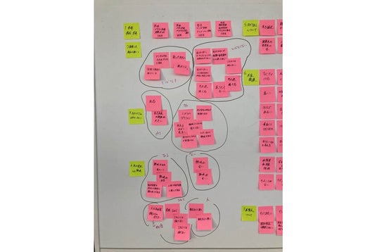 NTTデータCCSのビジネス開発チームと、京都精華大学メディア表現学部との共創がスタートしたのは2023年6月です。現在、芸大生が作品を発信する日常的なツールは何が多いのか、芸大生は自分の作品を果たして発信したいと思っているのかというユーザーニーズを探るため、メディア表現学部学生がそれぞれ芸術、デザイン、マンガ学部の学生にインタビューを行い、そこから得たキーワードをポストイットにデータとして書き出して、企業様とのワークショップを7月初旬に行いました。抽出されたキーワードは、壁一面を覆うボリュームになりました。