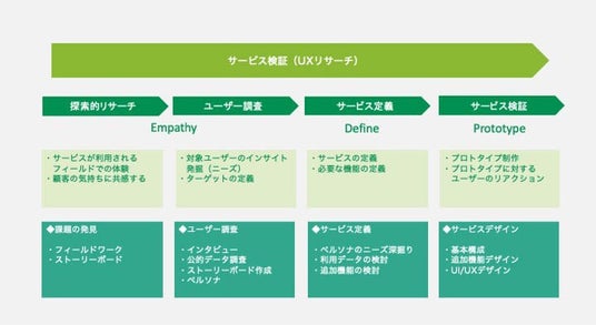 今回、学生たちが担当をしたのは、新しいWebサービスを創り上げる初期に必要な、ユーザーの本音やニーズを探る探索的リサーチと、調べたデータから具体的なユーザー像を作り出す「ペルソナ」の構築、ユーザーがサービスを利用する場面を想定して心理的な分析をする「共感マップ」、実際の利用シーンを仮説検証する「カスタマー・ジャーニー・マップ」の作成です。