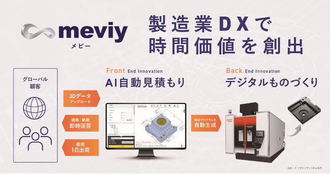 meviy は機械部品の 3D データをアップロードするだけで AI が自動で即時見積もり、独自のデジタル製造シス テムにより最短 1 日での出荷を実現します。これまで、機械部品調達時に発生していた作業時間の 9 割以上を 削減することで、お客さまの部品調達における非効率を解消するプラットフォームです。3 年連続で国内シェア No.1 を獲得、第 9 回ものづくり日本大賞において「内閣総理大臣賞」を受賞し、製造業の生産性向上において 高い評価を得ています。海外でのサービス提供も拡大しており、部品調達 DX を通じた時間価値をグローバル で提供しています。