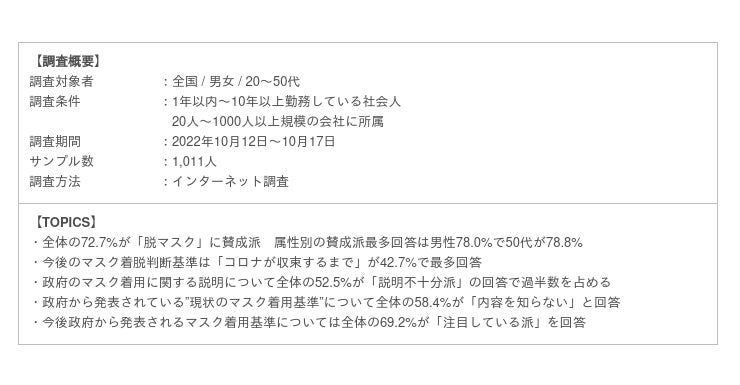 Job総研では1,011人の社会人男女を対象に、脱マスクに対する賛否やマスク着脱の基準にしていること及びいつまでマスク着用をするか、また現状のマスク着用基準の認知度や今後出される着用基準の注目度などについて調査した「2022年 マスク着用基準の実態調査」を実施しました。
