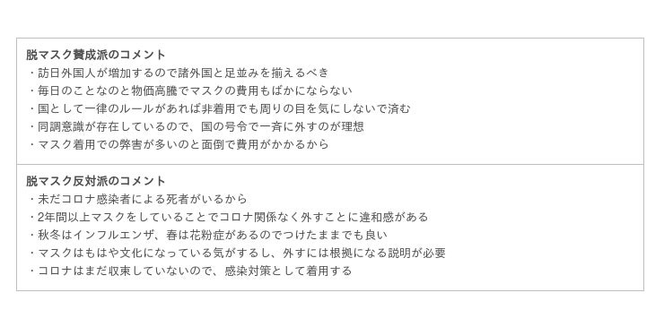 今回実施した「2022年 マスク着用基準の実態調査」では、脱マスク(マスク非着用)に対して7割が賛成派の回答をしました。その理由は「諸外国と足並みを合わせるべき」「マスクの費用もバカにならない」「マスク着用の弊害が大きい」などさまざまでした。そんな中「国の号令がなければマスク着用率は下がらず、同調意識が働いて外したくても外せない」といった脱マスクへの弊害を言及する同様の意見も多くみられました。