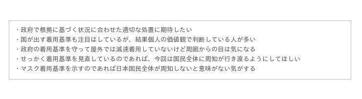 脱マスクやマスク着用基準について政府の対応へのコメントが顕著に見られました
