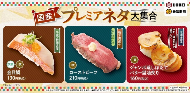 寿司レストランチェーンを展開する元気寿司株式会社(本社:栃木県宇都宮市 代表取締役会長兼社長 藤尾 益雄)は、全国の元気寿司・魚べいにて2023年2月9日(木) より、『国産プレミアネタ大集合フェア』を開催いたします。千葉県・静岡県から仕入れた、冬が旬の高級魚・金目鯛や香ばしくバター醬油とともに炙った北海道産ジャンボ蒸しほたてなど、旬の国産ネタをお得にお楽しみいただけます。