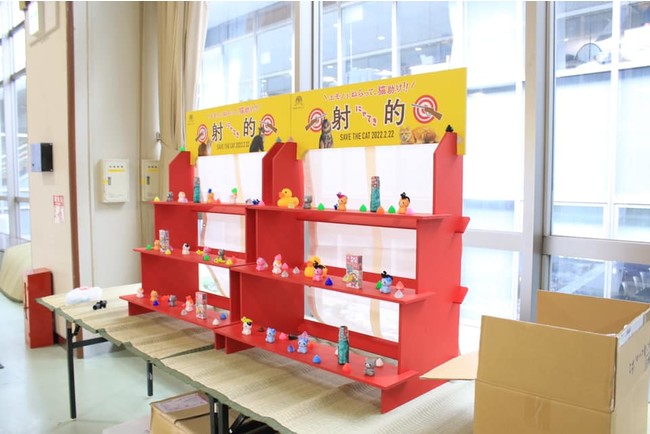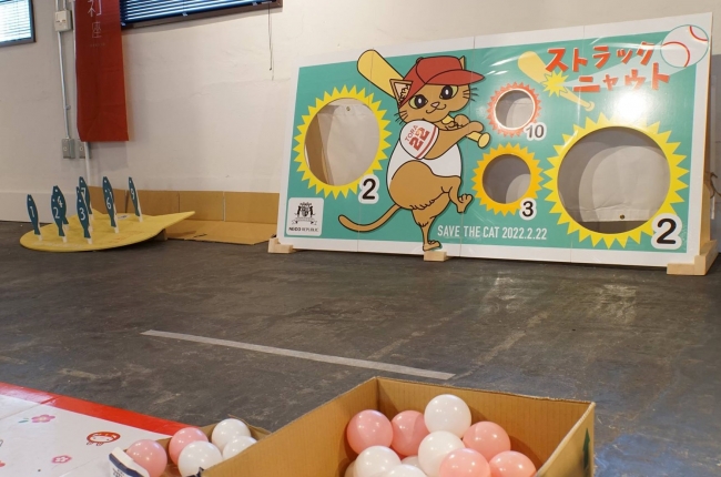 わにゃげ(輪投げ)、ストラックにゃうと(ボール投げ)、にゃてき(射的)など、お子さまが夢中になって楽しめる縁日遊びがたくさん登場。ご寄付いただいたら無料で楽しむことができ、ネコ祭りイベントを盛り上げます。