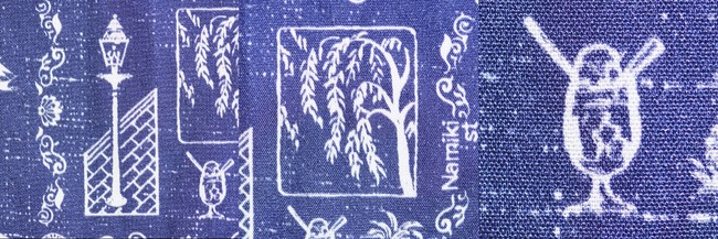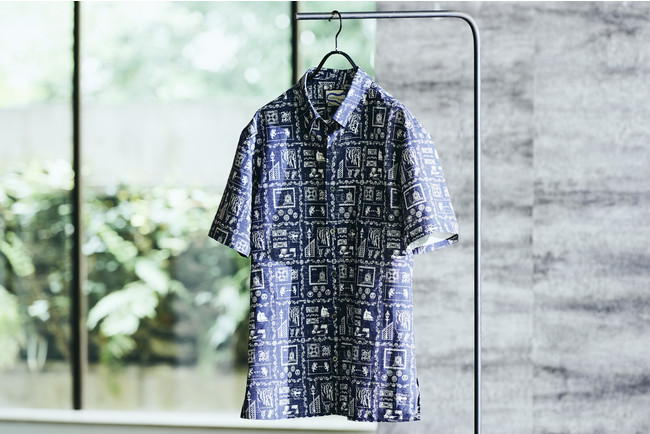 テーマは「銀座の街×沖縄」。銀座の街並みをイメージした格子柄をベースに、時計塔や建物のレリーフ、ガス灯や枝垂れ柳など銀座を象徴するモチーフと、沖縄を感じる絵柄を描きました。遊び心のあるデザインながらも、深みのあるネイビー生地と、艶のある黒蝶貝ボタンがシックな印象を放ちます。リゾートはもちろん、銀座の街にも合う、ファッション性の高い一枚です。