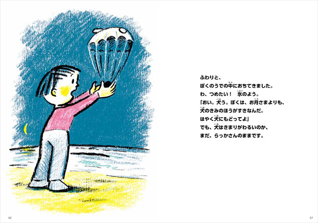 ▲物語の最後、やはりお月さまになれず、落下傘(パラシュート)になって落ちてきた犬に呼びかける「ぼく」。