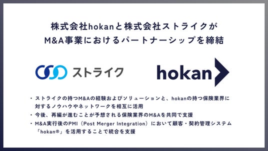 「適正な営業活動」と「組織の強固な監査体制」を実現するクラウド型保険代理店システム「hokan(R)」を提供する株式会社hokan(ホカン、本社:東京都中央区、代表取締役社長:小坂直之、以下:当社)と株式会社ストライク(本社:東京都千代田区、代表取締役社長:荒井 邦彦)は、この度、保険業界における事業承継や戦略的成長事業に関する各種課題の解決を目的としたM&A事業に関するパートナーシップを締結したことをお知らせいたします。