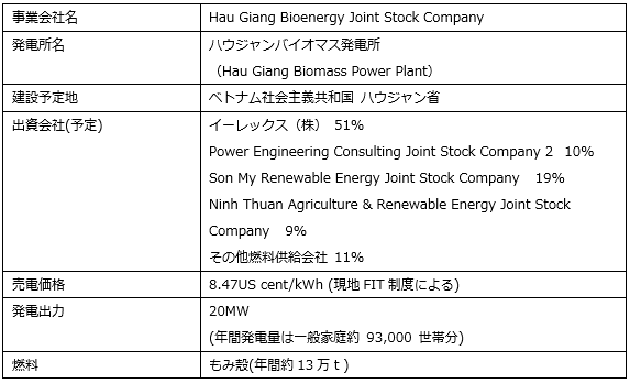 イーレックス株式会社(以下、「当社」)は、2021年10月1日付「ベトナム国バイオマス発電事業への出資参画のお知らせ」にて公表いたしましたとおり、ベトナム社会主義国(以下、ベトナム国)国営ベトナム電力総公社(EVN)傘下のPower Engineering Consulting Joint Stock Company 2(以下、「PECC2」))と、ベトナム国再生可能エネルギー発電事業者Son My Renewable Energy Joint Stock Company(以下、「Son My」)ほかと共にベトナム国ハウジャン省にて発電事業の開発を推進しておりました。