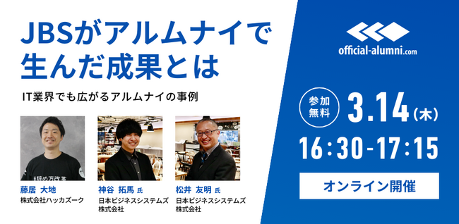 株式会社ハッカズーク(本社:東京都新宿区、代表取締役CEO:鈴木仁志)は、3/14(木)16時30分より、アルムナイの取り組みの特集にて2024年1月にテレビ東京「ワールドビジネスサテライト(WBS)」などにもご出演されました日本ビジネスシステムズ株式会社の松井 友明氏、神谷 拓馬氏をパネリストとしてお招きし無料オンラインセミナーを実施いたします。