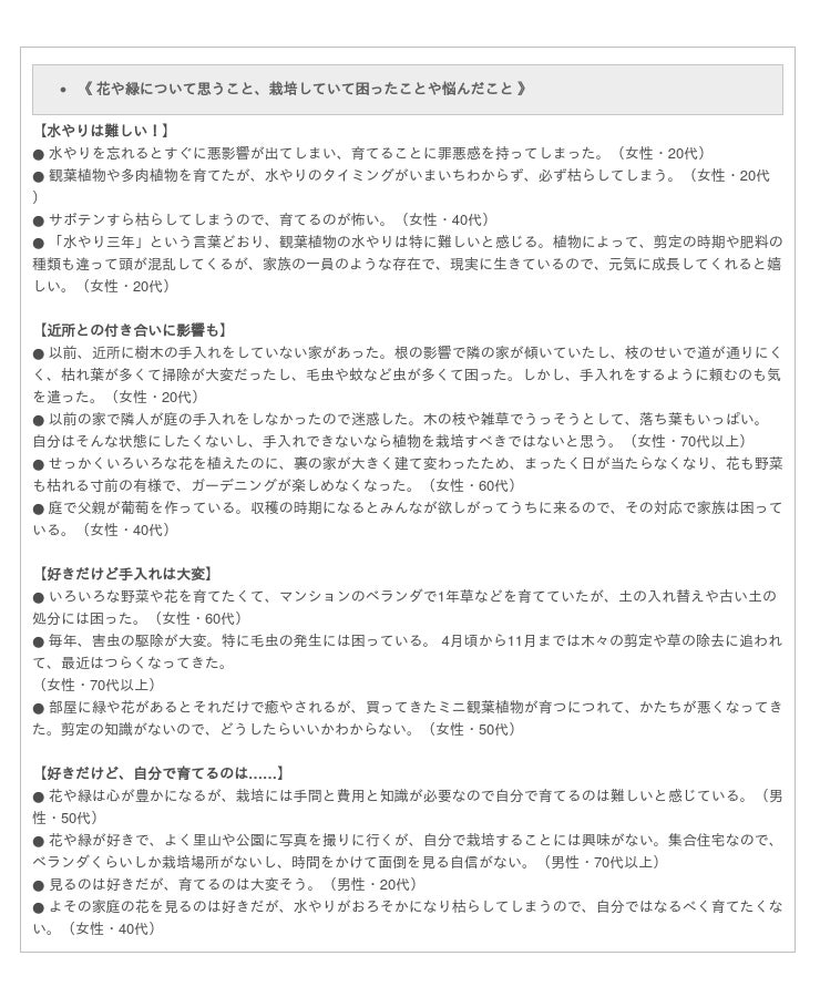 花や緑について思うこと、感じていること、栽培していて困ったことや悩んだことを自由回答で聞いたところ、「花が好き」「部屋に緑があると癒やされる」というポジティブな声が多く寄せられました。ただ、花や緑が好きで、実際に育てている人から「水やりが難しい」「どうしても枯らしてしまう」という声も。インターネットで栽培方法など、植物に関する情報を手に入れやすくなったものの、環境の違いからか、うまくいかず悩んでいる人もいるようです。
