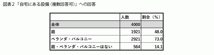 また、自宅に庭、ベランダ・バルコニーがあるかどうかを聞きました(図表2)。自宅にある設備と花や緑が好きかどうかの相関を見ると(図表3)、「庭がある」人と「ベランダ・バルコニーがある」人との間にはほとんど差がありません。
