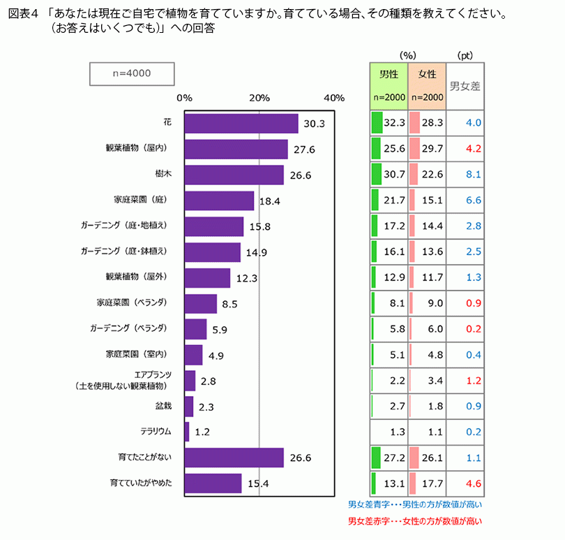 自宅で植物を育てているか聞いたところ(図表4)、育てているもののトップ3は「花」(30.3%)、「観葉植物(屋内)」(27.6%)、「樹木」(26.6%)の順でした。