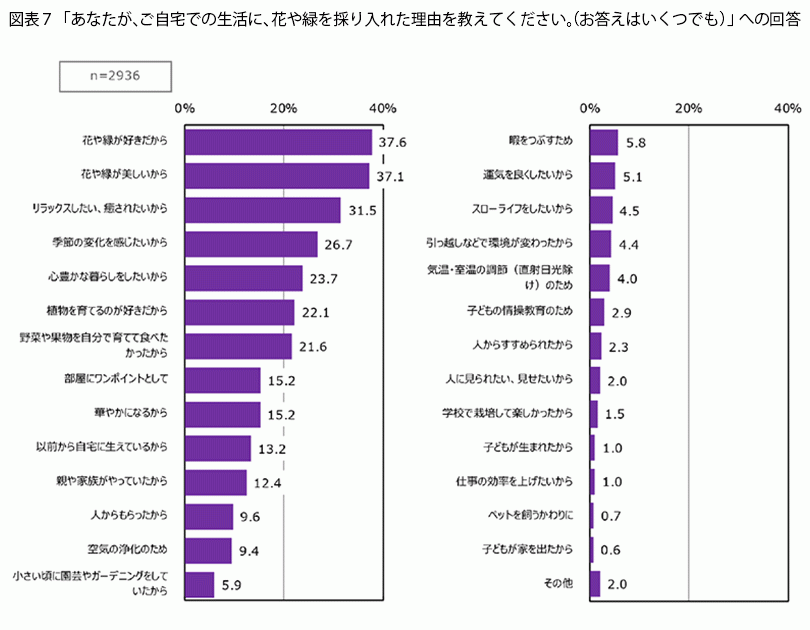 自宅での生活に花や緑を採り入れた理由を聞いたところ(図表7)、2割以上の人が理由として挙げたのは、割合が高い順に、「花や緑が好きだから」(37.6%)、「花や緑が美しいから」(37.1%)、「リラックスしたい、癒されたいから」(31.5%)、「季節の変化を感じたいから」(26.7%)、「心豊かな暮らしをしたいから」(23.7%)、「植物を育てるのが好きだから」(22.1%)、「野菜や果物を自分で育てて食べたかったから」(21.6%)でした。