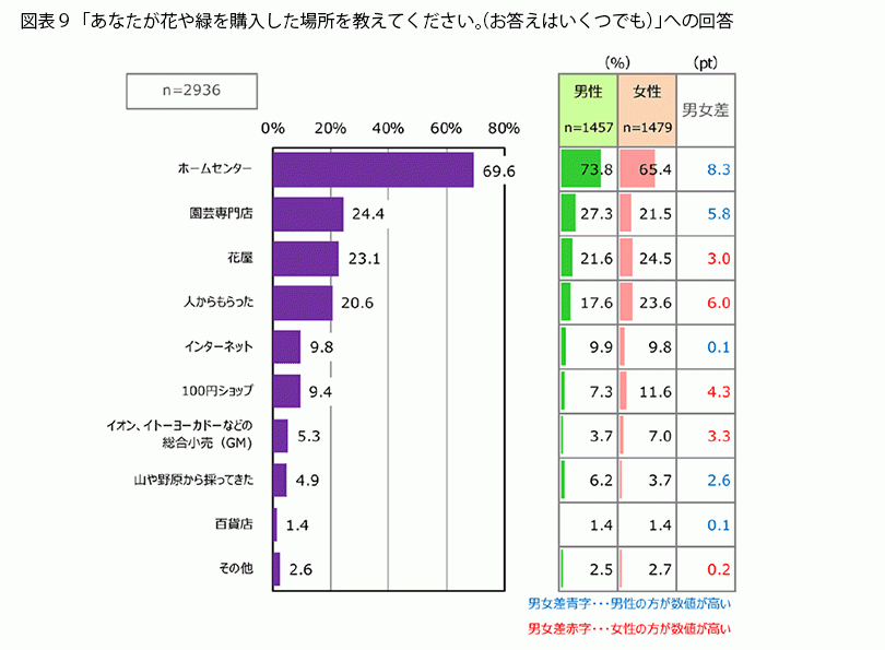 「あなたが花や緑を購入した場所を教えてください」(図表9)と聞いたところ、圧倒的に多かったのが「ホームセンター」(69.6%)でした。2位と3位の「園芸専門店」(24.4%)、「花屋」(23.1%)と比べても、かなりの差があります。
