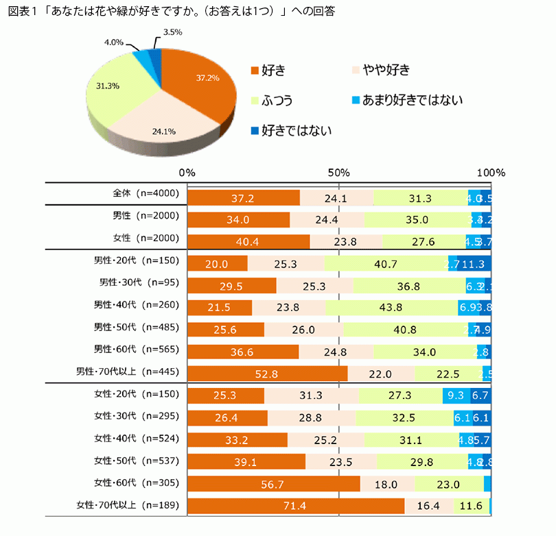 「あなたは花や緑が好きですか」という質問に対して、「好き」と回答した人は37.2%、「やや好き」は24.1%、「ふつう」は31.3%、「あまり好きではない」は4.0%、「好きではない」は3.5%でした。男女ともに年齢が上がるほど「好き」という人の割合が高い傾向にあり、「男性・70代以上」「女性・60代」「女性・70代以上」は「好き」の割合が50%を超えています。