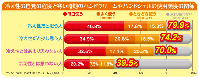 寒さや乾燥が気になる季節になると、ハンドクリームやハンドジェルを使用する機会が増えます。当社が独自に調査したところ、冷え性を自覚している人ほど、ハンドクリームやハンドジェルの使用頻度が高く、温感への潜在ニーズがうかがえる結果となりました(下図参照)。