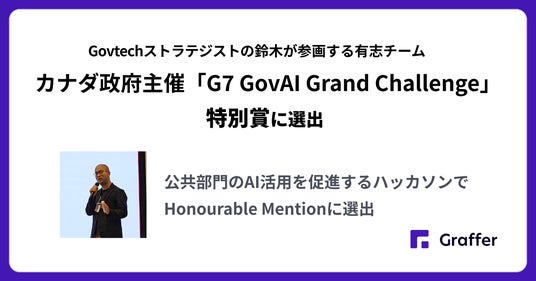 株式会社グラファー(本社:東京都渋谷区、代表取締役:石井大地、以下「グラファー」)は、カナダ政府が主催した「G7 GovAI Grand Challenge」において、当社Govtechストラテジストの鈴木宏和が参画する有志チームがHonourable Mention(主催者による特別な評価)に選出されたことをお知らせします。本ハッカソンは、2025年6月のG7カナナスキス・サミットでの合意に基づき、公共部門におけるAI活用の加速と、効率的かつ透明性の高い行政サービスの実現を目指して立ち上げられた国際的なプロジェクトです。今後も当社では、官民の枠を超えて活動する高度な専門人材の挑戦を支援するとともに、世界基準のAI活用に関する知見を蓄積し、行政サービスの利便性向上やデジタル社会の発展に貢献してまいります。
