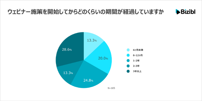 「ウェビナー施策を開始してからの期間」は、「3年以上」が約29%と最も多く、コロナ禍となりすぐに実施を開始した企業が多いことがうかがえます。