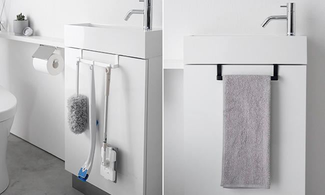 手に取りやすい位置に掃除アイテムを掛けることができ、タオル掛けとしても使うことができます。