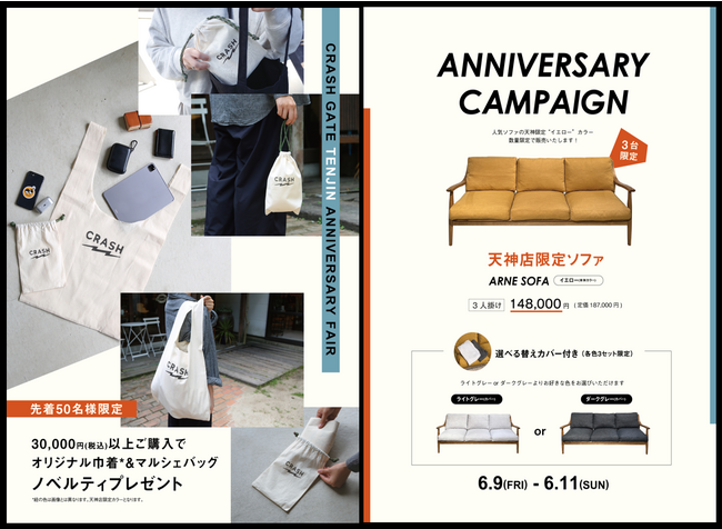 株式会社関家具(福岡県大川市、代表取締役社長:関 正、以下関家具)が運営する、「CRASH GATE福岡天神店×関家具 福岡ショールーム」は、2023年6月9日(金)から6月11日(日)までの3日間「3周年セール」を開催いたします。