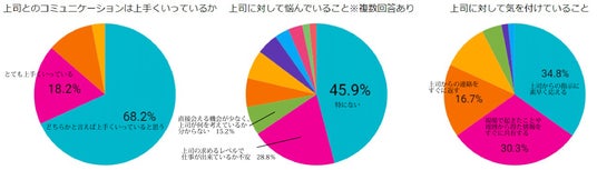 これらの結果から、9割近い社員が上司もしくは部下とコミュニケーションが上手くいっていると感じてはいるものの、悩みがない人は4割前後程度で、半数以上は悩みがあることが分かった。また、部下は仕事のレベルを気にかけているのに対して、上司は仕事のレベルよりも情報を上げてほしいと感じていることも見えてきた。