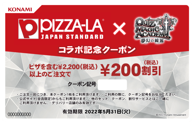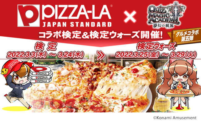 株式会社コナミアミューズメントは、アーケードゲーム『クイズマジックアカデミー 夢幻の鏡界 (むげんのきょうかい)』において、グルメコラボ第5弾「PIZZA-LA(ピザーラ)×QMA(キューエムエー)」コラボ検定&検定ウォーズを、3月3日(木)から開催することをお知らせします。