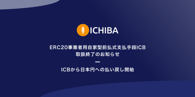 JPYC株式会社(旧商号:日本暗号資産市場株式会社)(東京都千代田区、代表取締役:岡部典孝)(以下「当社」といいます)は、当社が発行するERC20事業者用自家型前払式支払手段であるICHIBA(以下「ICB」といいます)は3月31日をもちまして、廃止をいたしました。4月7日に払い戻し公告を行います。ICBに関しての払い戻し申出期間は2022年4月7日から2022年7月6日とします。なお、期間内にお申出をしなかったICBをお持ちのお客様は、当該払い戻しの手続きから除斥されますので、ご注意ください。これまでのご愛顧、誠にありがとうございました。
