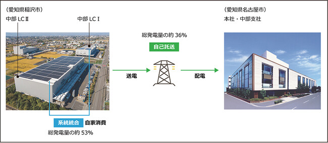 株式会社サンゲツ(本社:愛知県名古屋市、代表取締役 社長執行役員:安田正介)は、2月1日(木)より、愛知県稲沢市にある中部ロジスティクスセンターII(以下、中部LCII)の太陽光発電設備で発電された電力の一部を、愛知県名古屋市にある本社・中部支社へ送る自己託送を開始しました。