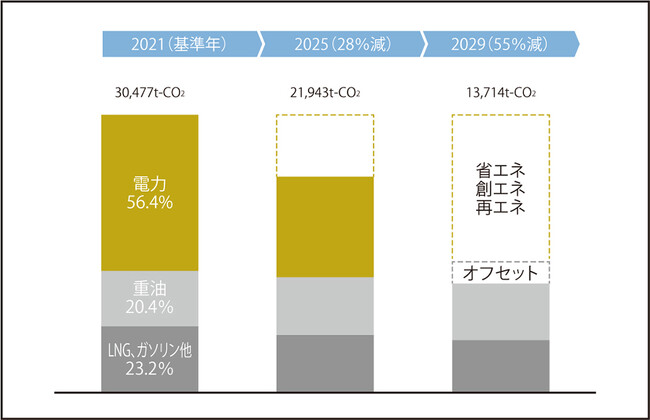 グループ全体のGHG排出量は、2025年度に28%削減、さらに2029年度に55%削減(ともに2021年度比)を目標に掲げ、省エネ、創エネ、再エネ、オフセットの4つの施策を中心に取り組んでいます。省エネは、自社物件の空調設備更新や燃料転換、営業車のハイブリッド車・EV車への切り替え、創エネは太陽光発電などの再生可能エネルギー発電設備の設置、再エネはCO2フリーの電力メニューへの切り替え、オフセットは植林団体への支援や電力証書の購入といった施策を計画しています。