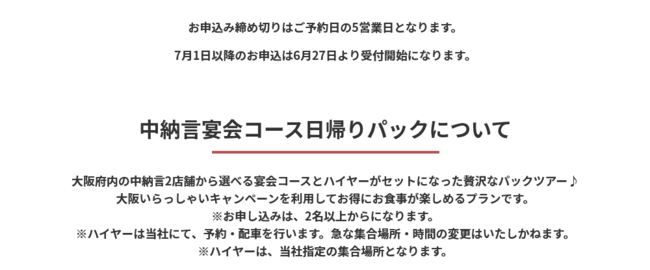 株式会社フォーティーズ(本社:大阪市鶴見区、代表取締役 岡武史)は7月14日迄延長となった【大阪いらっしゃいキャンペーン2022】の対象商品として人気の中納言+ハイヤー片道がセットになったパックツアーを6月27日より販売開始ます