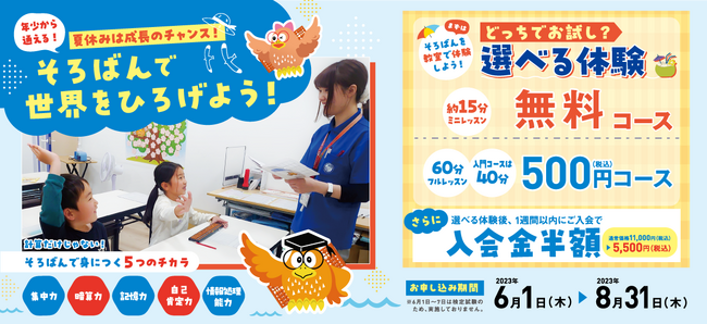 セイハネットワーク株式会社(福岡県福岡市,代表取締役:坂口 正美,以下セイハネットワーク)は、そろばん教室88くんから夏のお得なキャンペーンをご案内させていただきます。しかも今回は選べる2つの体験レッスンをご用意!