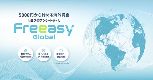 年間3万件以上の調査実績を誇る、国内最大級のセルフ型アンケートツール「Freeasy(フリージー)」を展開するアイブリッジ株式会社(本社:大阪市福島区、代表取締役社長:荒川和也)は、簡単かつスピーディーに海外の24カ国13言語の国と地域のモニターに対してWeb調査を実施できる、『Freeasy Global』の提供を開始いたしました。